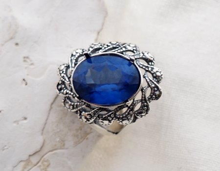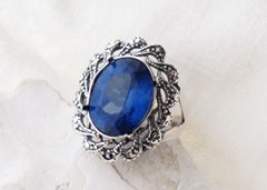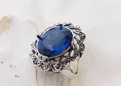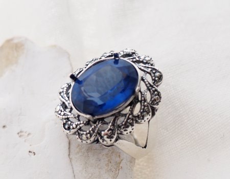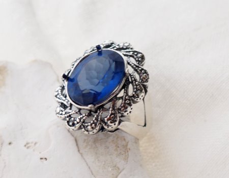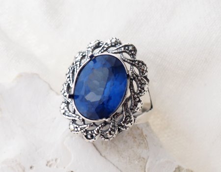 Kamień zostanie osadzony w kunsztownej, srebrnej koronie w stylu Vintage/Art Deco. Ażurowe zdobienia i delikatne oksydowanie (przyciemnienie srebra) stanowią idealny kontrast dla intensywnego błękitu kamienia, podkreślając jego blask, ale nie odwracając od niego uwagi.