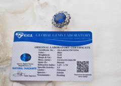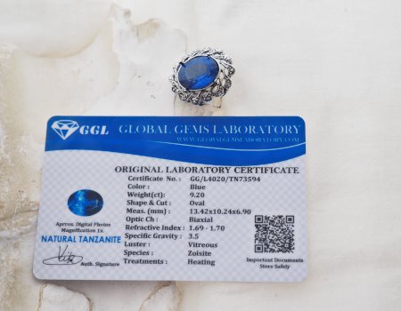 Wraz z pierścionkiem otrzymasz widoczny na zdjęciu Certyfikat Laboratoryjny GGL. Potwierdza on autentyczność kamienia, jego naturalne pochodzenie (Species: Zoisite) oraz masę 9.20 ct. To Twoja gwarancja jakości.