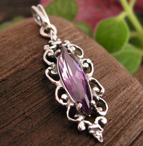 DELIKATNY SREBRNY WISIOREK, W KTÓREGO OKSYDOWANĄ AŻUROWĄ OPRAWKĘ ZOSTAŁ ZAKUTY PIĘKNIE WYBARWIONY AMETYST - SYNTETYCZNY.