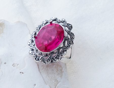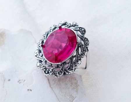 Barwa tego kamienia jest nasycona, głęboka i pełna blasku. To nie jest blady róż – to kolor fuksji i szlachetnego wina. W połączeniu z chłodnym odcieniem srebra tworzy kompozycję, od której trudno oderwać wzrok.