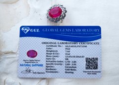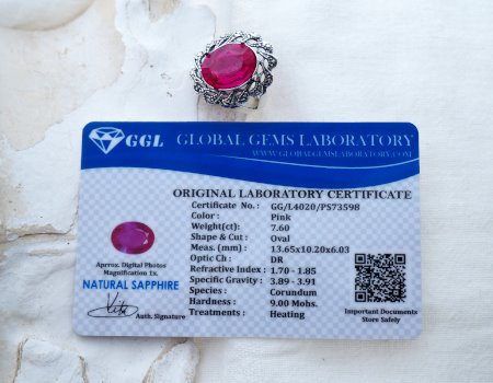 Kamień został objęty srebrną ramą (próba 925) inspirowaną stylem retro. Oksydowane srebro z misternymi, ażurowymi zdobieniami wokół korony wydobywa "ogień" z różowego szafiru. To połączenie klasycznej elegancji z nowoczesną odwagą koloru.
