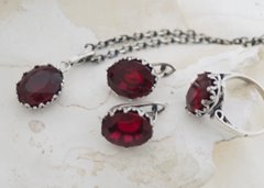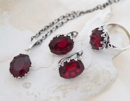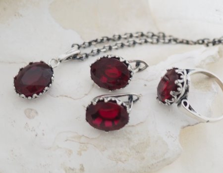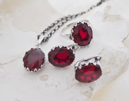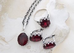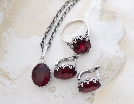 Odkryj kwintesencję elegancji i pasji zamkniętą w tym niezwykłym zestawie biżuterii. Stworzony dla kobiety, która pragnie podkreślić swoją indywidualność głębokim kolorem i szlachetnym blaskiem, ten komplet jest hołdem dla piękna natury i mistrzowskiego rzemiosła. Zestaw składający się z pierścionka, kolczyków i wisiorka to harmonijne połączenie, które rozbudzi Twoje zmysły.