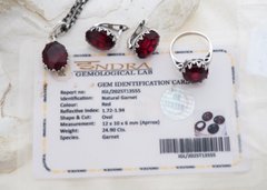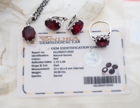 Aby zapewnić Ci pełne zaufanie i pewność co do autentyczności oraz najwyższej jakości tego wyjątkowego zestawu, dołączamy oryginalny certyfikat identyfikacyjny z renomowanego IGL Gemological Laboratory. Dokument ten potwierdza, że użyte kamienie to naturalne granaty, z podaniem ich parametrów gemologicznych: pięknego czerwonego koloru, owalnego szlifu oraz łącznej wagi 24.90 ct. Certyfikat jest dowodem na unikalność i wartość tej inwestycji w piękno.