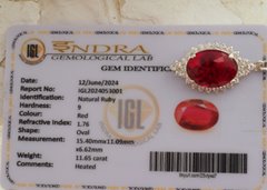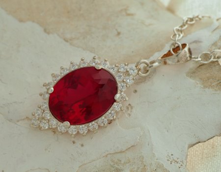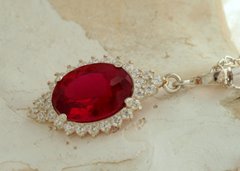 Kamień główny: Naturalny Rubin (Natural Ruby). Wokół kamienia w wieńcu obsadzono także kilkadziesiąt cyrkoni aby dodatkowo rozświetlały wisior.