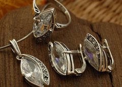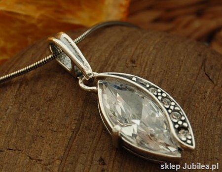 Piękny stylowy srebrny wisior, którego owalny kształt wypełnia kryształowa markiza przełożona srebrną wstązką w której umieszczono po 4cyrkonie.
