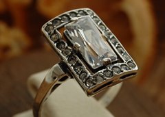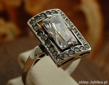 Stylowy srebrny pierścionek, który swoją stylistyką nawiązuje do biżuterii z trendu Art deco. W centralnym miejscu prostokątu wkomponowano cyrkonie 5x10mm, a na brzegu aż 24 kryształki Swarovskiego.